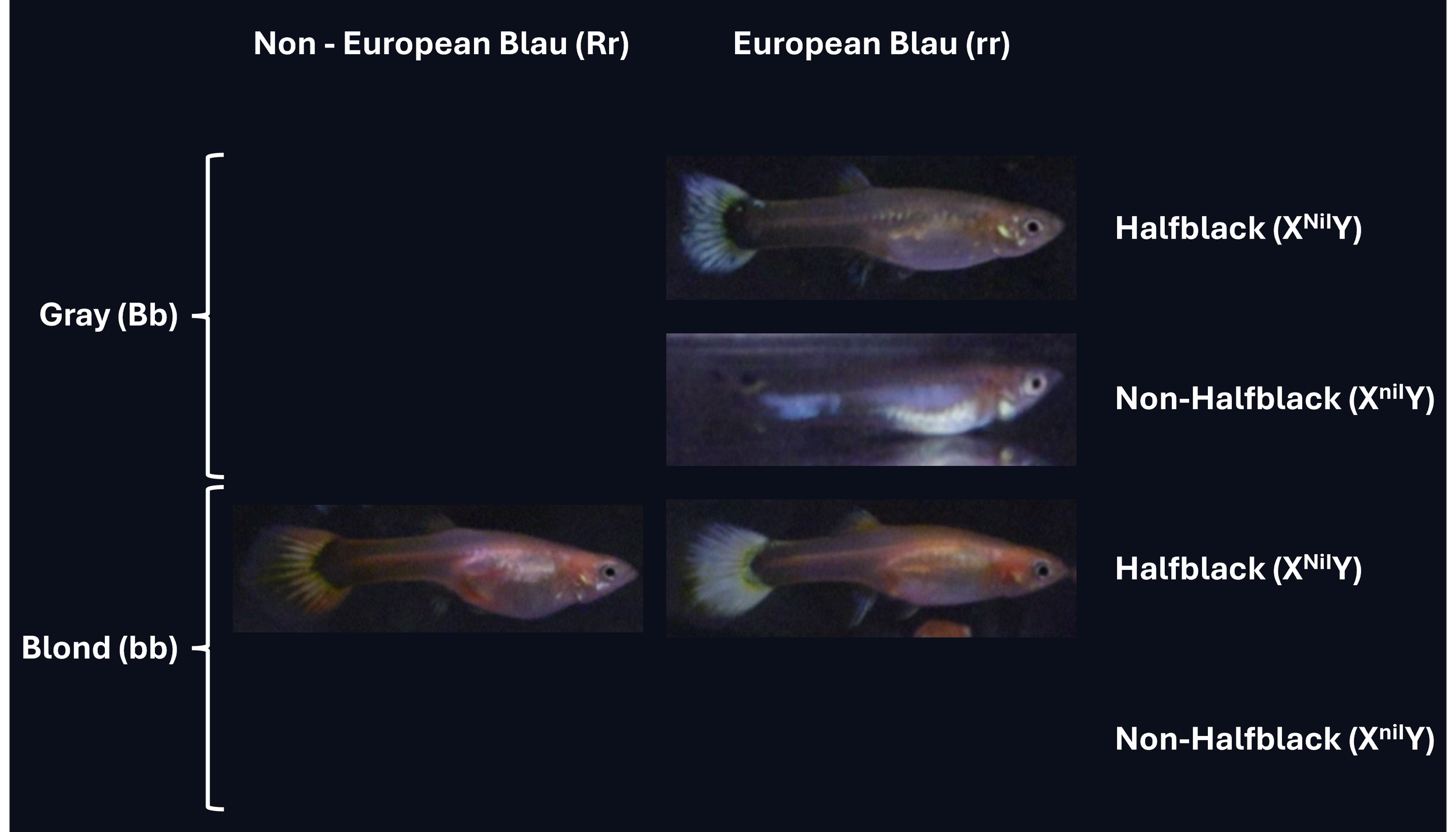 The females showed a similar phenotype distribution to the males, though Stoerzbach was much harder to distinguish in them. With only seven females in total, getting a statistically accurate representation was difficult. I also suspect I may have misidentified a few males as females early on. For instance, the gray, non-halfblack, European Blau "female" showed male traits but lacked a mature gonopodium. Reclassifying these late-blooming males would bring the total female count down even further.